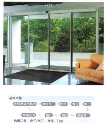 防强风阻碍功能: 当自动门正处于闭合过程中,如遇外界强风阻碍门扇时,控制系统即进行自动矫正,提高马达力距,强迫门扇闭合。